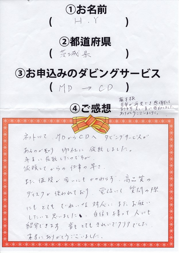 ネットにてMDからCDへダビングサービスがあるのを知り、御社に依頼しました.。