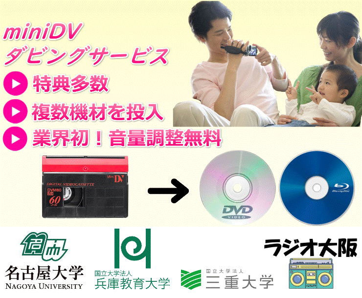 また、当ダビングサービスは他社とは全く異なるサービスです。他社では手の届かない特典を多数盛り込んでいます。作業工程を丁寧に行っており、業界初の音量正規化を全テープ無料、miniDVテープ冒頭・巻末の未記録部分も全テープ無料カットしています。 |